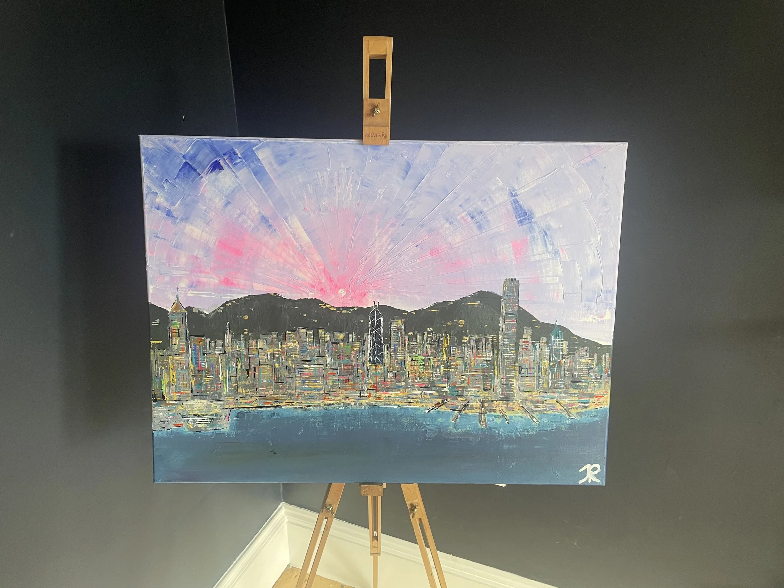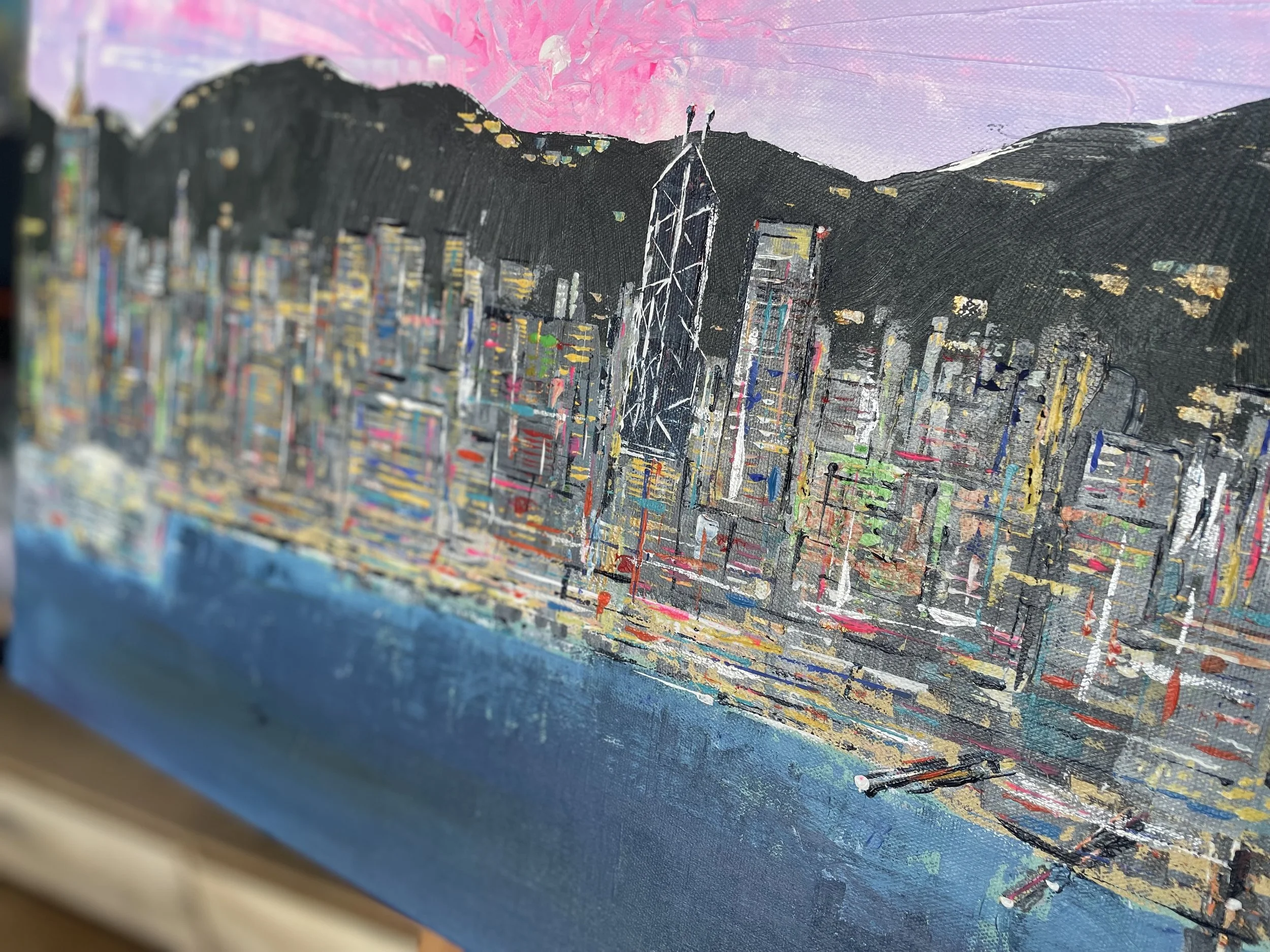 The painting portrays a breathtaking cityscape sunset of Hong Kong Island, bursting with a vibrant array of colors showcasing the city's skyline as it is bathed in the warm hues of the setting sun.